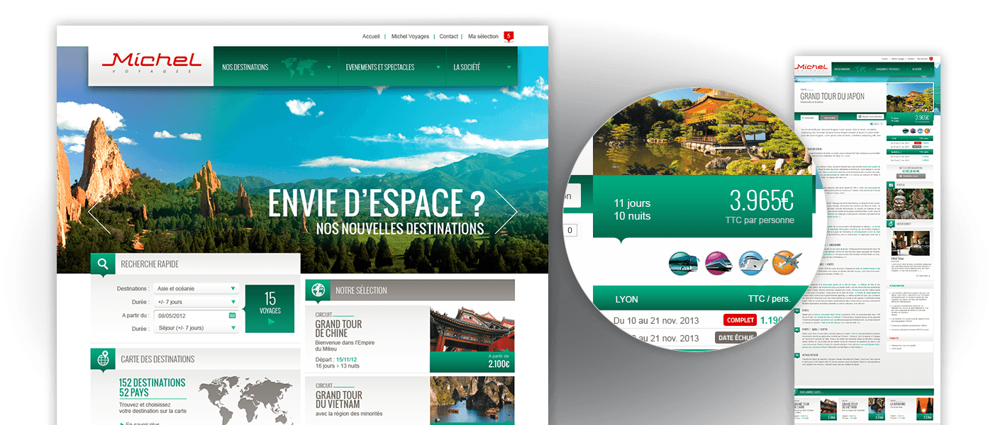Michel Voyages compte parmi les leaders français des voyages en car. L’entreprise fait confiance depuis de nombreuses années à Studiobis pour produire ses outils de communication. Le développement d’un intranet pour la gestion des contenus a facilité la mise à jour des textes, photos et tarifs sur les différents supports du groupe. Studiobis s’est également chargé de la refonte graphique de son site Ecommerce et produit, chaque année, les brochures, catalogues et supports numériques du voyagiste.